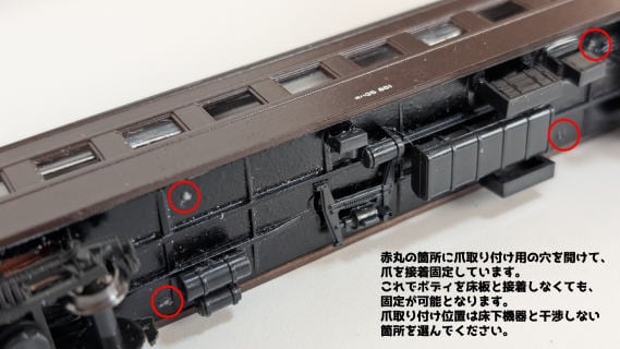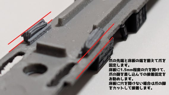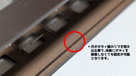 床板に爪を固定する事で、ボディを床板に接着しなくても取り外し可能な状態で固定が可能となります。